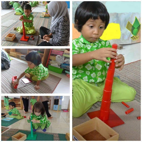 tu Material Montessori di area Sensorial adaalah Knobless Cylinder, material yang satu ini sangat digemari anak-anak, sehingga mereka bisa berlama-lama khusyuk (long span attention) berkerja dalam meraba, mengira-ngira lalu menyusun material yang terbuat dari kayu dalam berbagai bentuk, warna dan dimensi tersebut. Adapun hal yang hendak dicapai dalam kegiatan ini adalah :