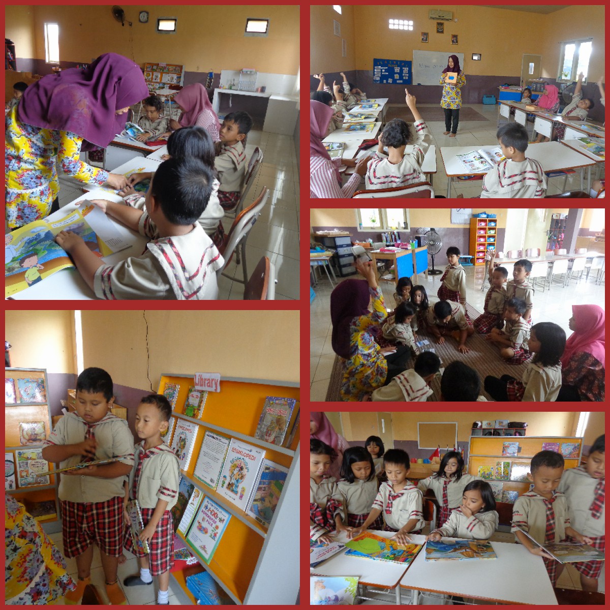 Saat pembelajaran English Thematic (program plus Awliya) dengan tema “Where can we find water?”, guru menunjukkan realia water and land form (lake & river), lalu bermain games “what’s missing” dengan menggunakan picture cards (rain, river, lake, reservoir, pond, & sea), setelah itu mereka dibuat penasaran dengan mencoba menemukan gambar2 dan tulisan yang sama di buku mereka masing2, (maklum sebagian siswa blm terbiasa membaca teks inggris), masih belum selesai, mereka diajak ke mini library yang ada di kelas untuk mencari dan menemukan aneka buku yang ada di situ yang ada gambar mengenai water… tak diduga mereka menemukan juga di buku yang bahkan kita tidak terpikir di situ ada tentang air…