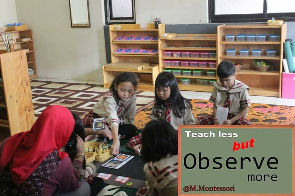 Di dalam pembelajaran, siswa lebih banyak beraktifitas guru lebih banyak mengamati. Seperti kata Montessori, “Teach less but observe more”
