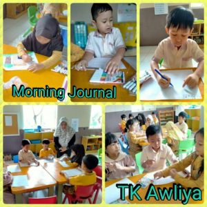 Kegiatan rutin setiap pagi setelah circle time di PG/TK Awliya diantaranya adalah ‘morning journal’. Anak2 dipantik untuk mengekspresikan buah pikirannya (imajinasinya) secara bebas dalam bentuk coretan-coretan, bisa berupa gambar atau tulisan. Dari sini akan terlihat perkembangan kemampuan berimajinasinya dan kemampuan merealisasikan pikirannya sekaligus melatih motorik halusnya.