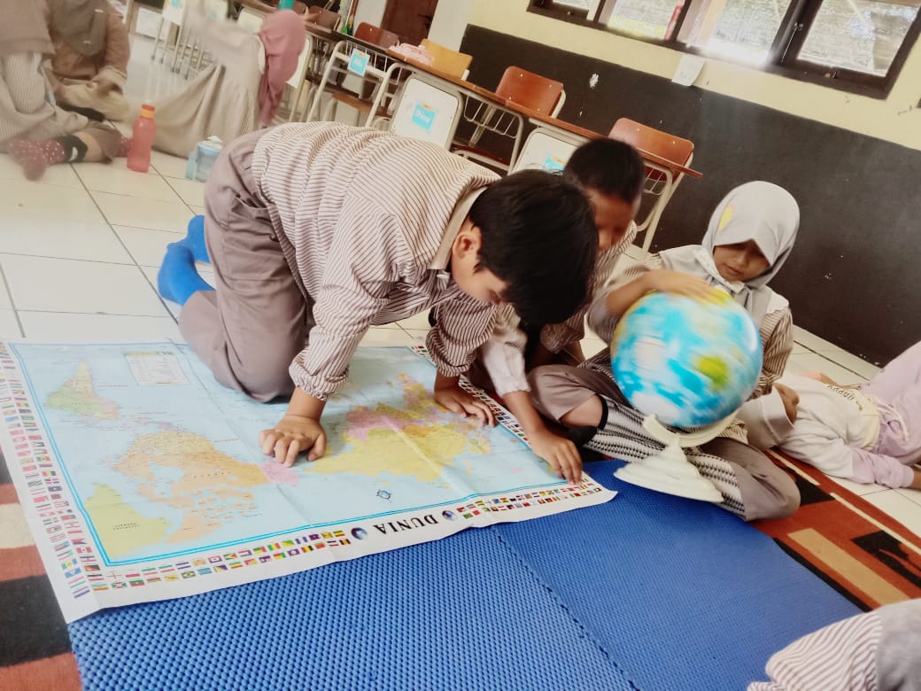 3. Peta dan Bendera: Anak-anak menggunakan peta puzzle benua dan negara untuk mempelajari lokasi berbagai wilayah, serta bendera dan ciri fisik utama setiap wilayah.
