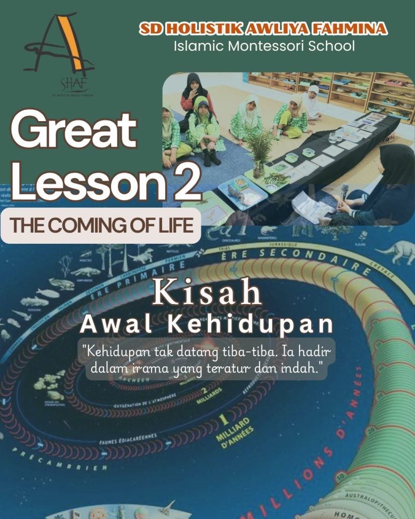 Great Lesson ke-2: The Coming of Life, dengan pendekatan khas SD Awliya sebagai Islamic Montessori School. Narasi ini akan membangun kelanjutan dari kisah penciptaan alam semesta menuju kehidupan pertama di bumi, sekaligus mengintegrasikan nilai-nilai Cosmic Education dan ajaran Islam.