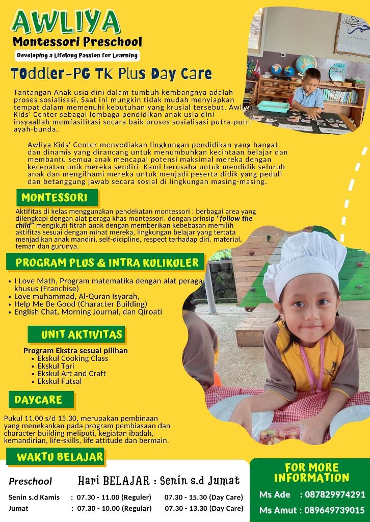 Waalaikum salam. Mangga jika Ibu berminat dan ingin menanyakan lebih jauh tentang Playgroup dan TK Awliya, bisa langsung menghubungi ke no WA +62821-2082-4292